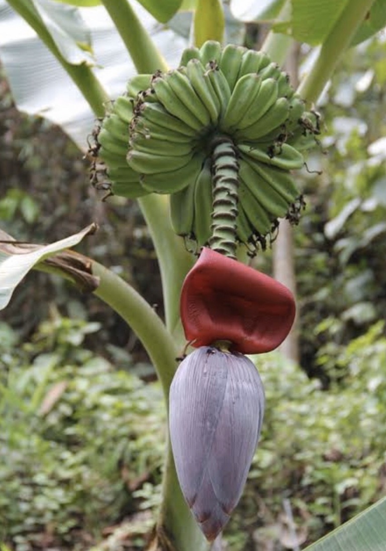 คำอธิบาย : ต้น ลำต้นสูง 3-3.50 เมตร เส้นผ่าศูนย์กลาง 15 ซ.ม. กาบลำต้นด้านนอกสีเขียว ตรงโคนสีชมพู ไม่มีไขมาก กาบลำต้นด้านในสีชมพู ก้านใบมีครีบสีเขียว เส้นกลางใบสีเขียว ไม่มีปื้นดำ