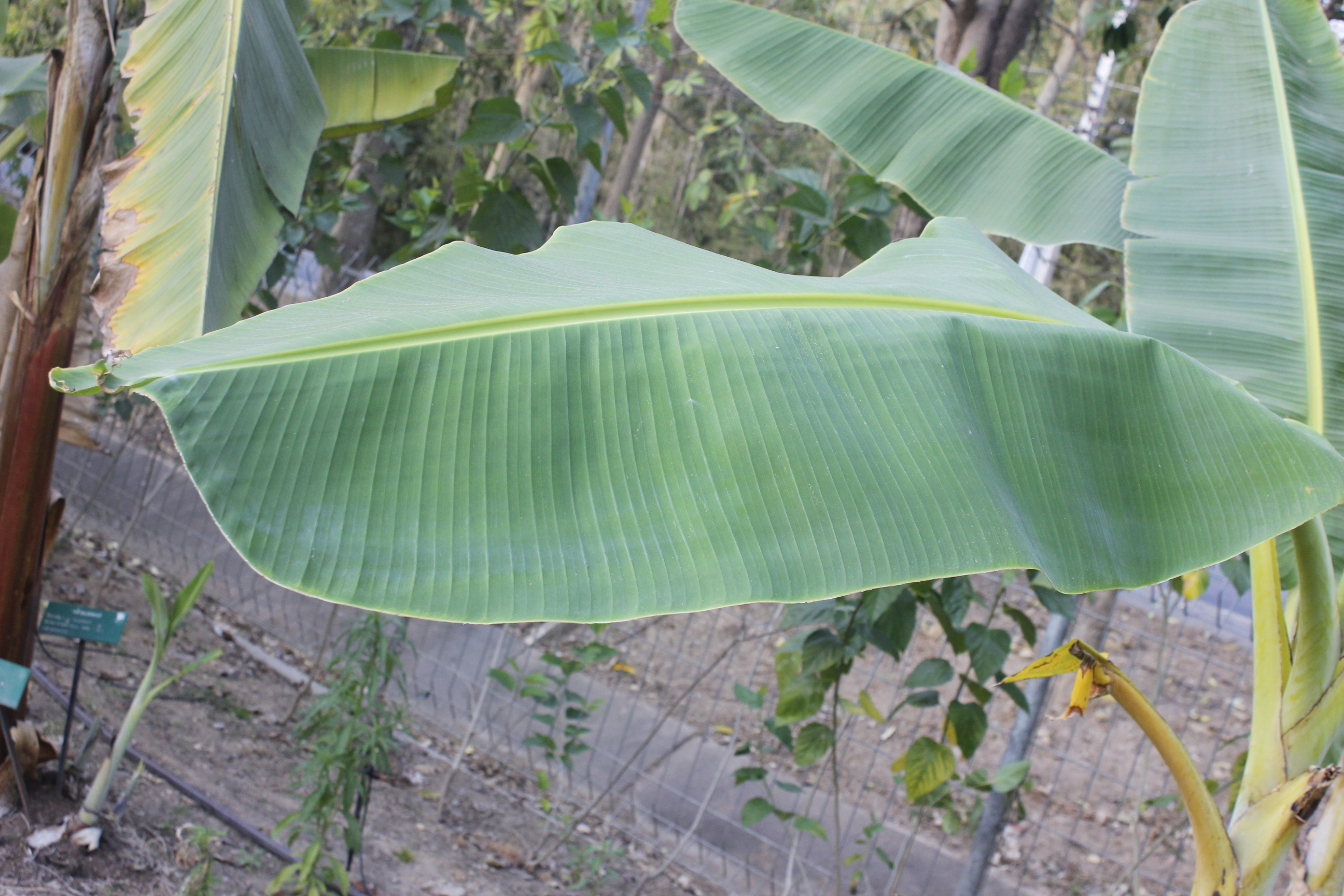 คำอธิบาย : ใบ ก้านใบยาวประมาณ 1.0-1.5 ม. ร่องก้านใบตื้น ใบรูปขอบขนานแกมรูปใบหอก กว้างประมาณ 25-35 ซม. เนื้อใบค่อนข้างหนา ท้องใบมีนวลสีขาว หน้าใบสีเขียวสดเป็นมัน